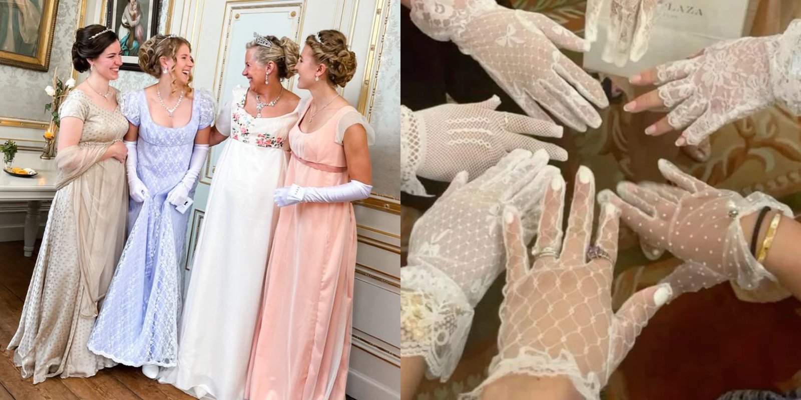 Think romantic pastels, lace, pearls, soft florals, gloves, and timeless sophistication.